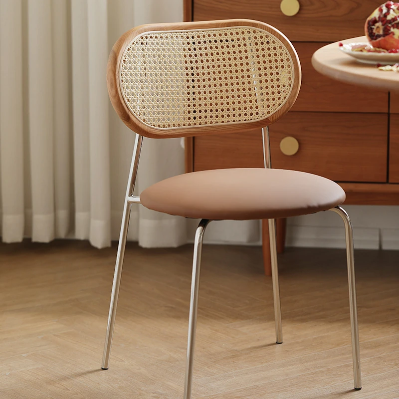 北欧スタイルの無垢材ダイニングチェア!おしゃれなステンレス製バックサポートで、小さなお部屋にもぴったり。レトロなラタン編みデザインが魅力的なヴィンテージ家具。快適さとスタイルを両立させた一品です!